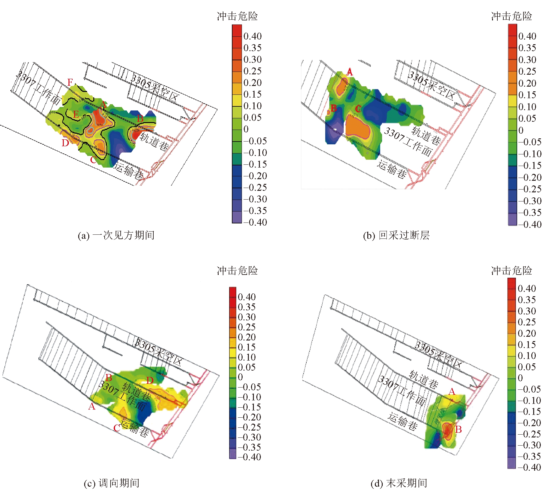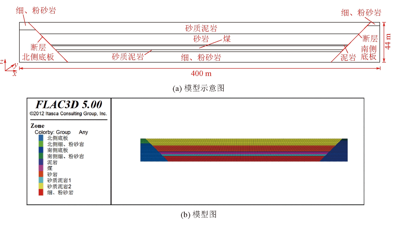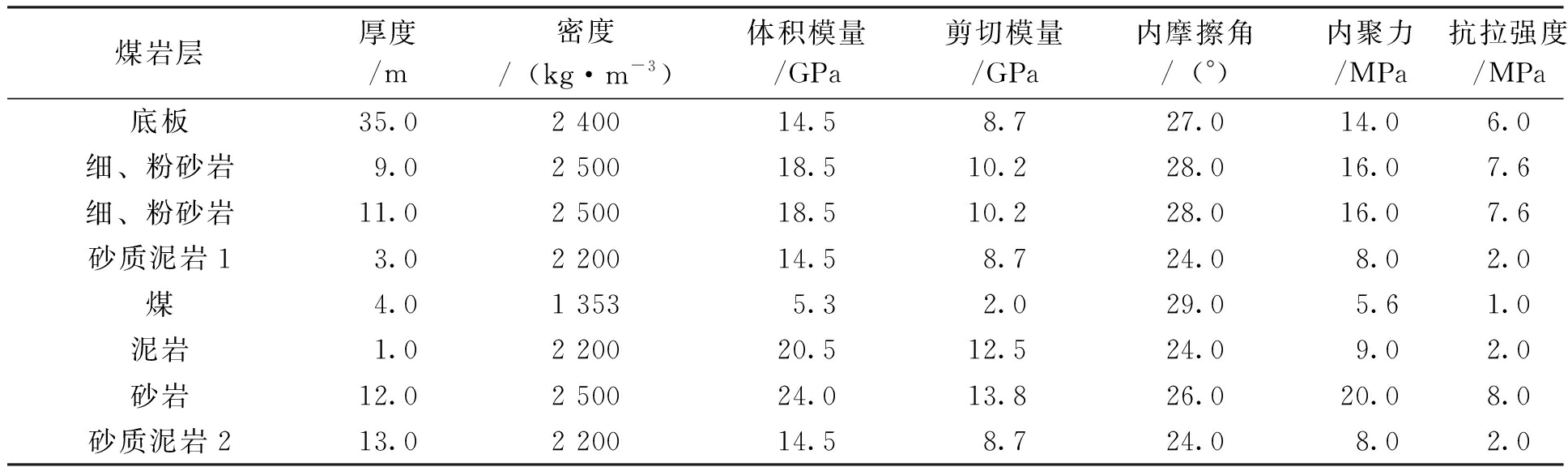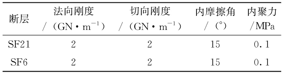 断层法向刚度/(GN·m-1)切向刚度/(GN·m-1)内摩擦角/(°)内聚力/MPaSF2122150.1SF622150.1 表3 煤岩体物理力学参数