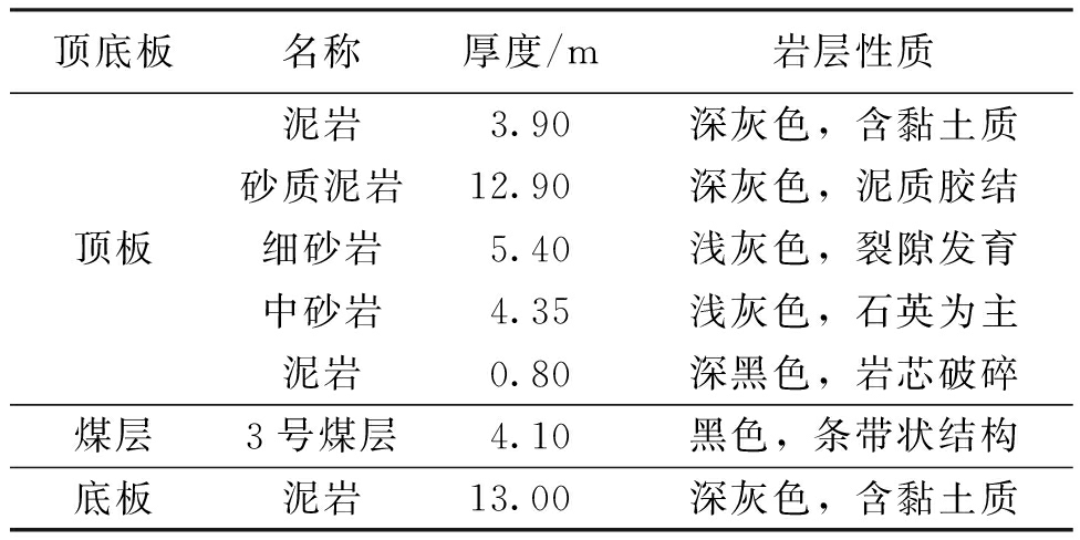 图1 3307工作面位置剖面 工作面开采3号煤层,煤层平均厚度4.1 m,平均倾角13°,普氏硬度1.48,采用综放开采工艺一次采全高。煤层顶底板岩层情况见表1。 表1 煤层顶底板岩层情况表