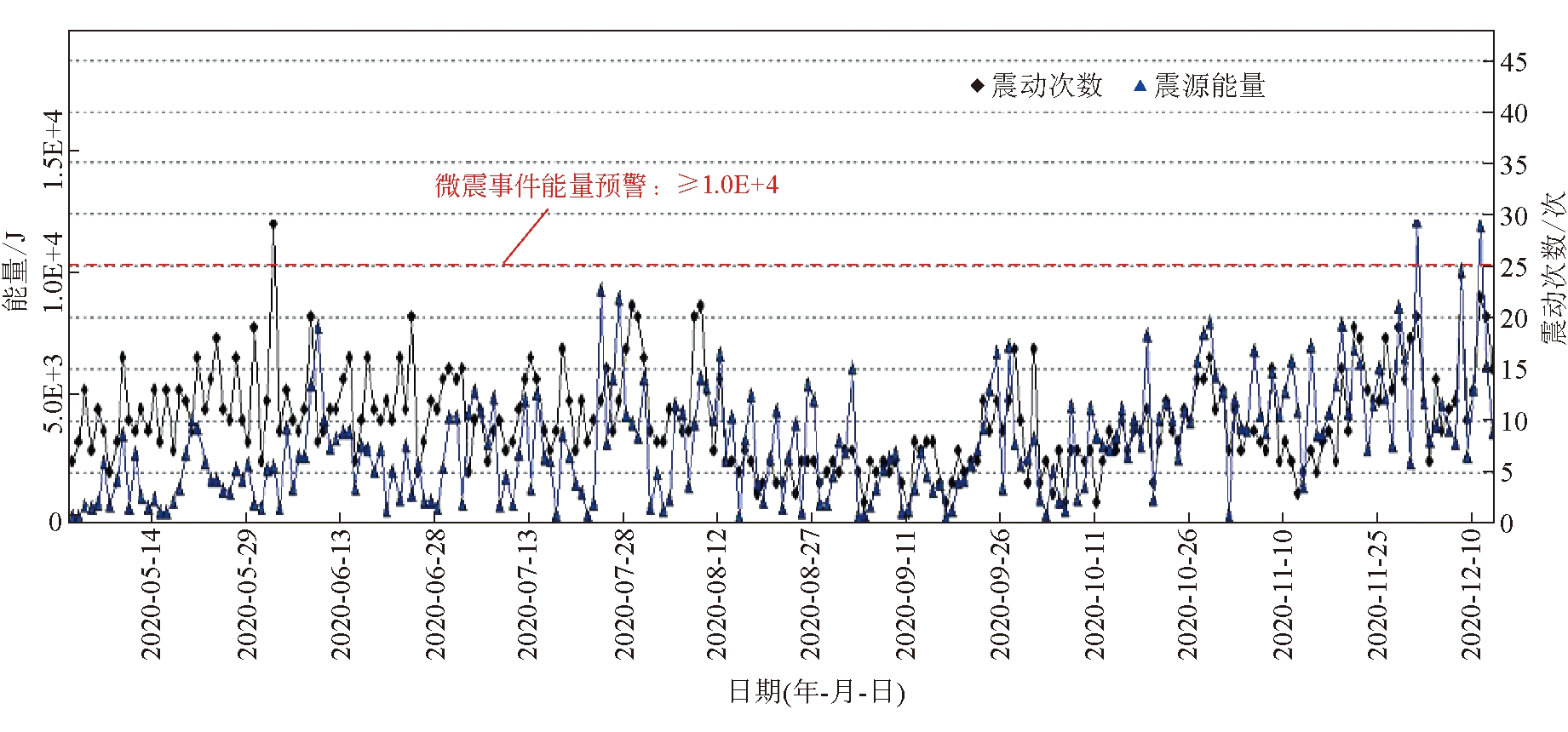 图8 3307工作面CT探测危险区示意 4 工作面冲击地压治理效果验证3307工作面从2019年11月开始回采,至2021年5月工作面已安全回采完毕。根据现场监测数据及记录,采用超前危险区预测-大直径钻孔强卸压-多源信息监测预警于一体的冲击地压综合防治技术后,3307工作面生产过程中未出现强矿压显现及冲击地压事件。 3307工作面微震活动规律分析(部分)如图9所示。由图9可知,在工作面生产期间,微震活动始终较平缓,微震事件数波动较大,但微震总能量一直处于较低水平(<1.0×104 J),仅在工作面回采过断层期间出现2个大能量事件,但微震能量未超过1.5×104 J,并进行了及时处理,保障了工作面的安全高效开采。