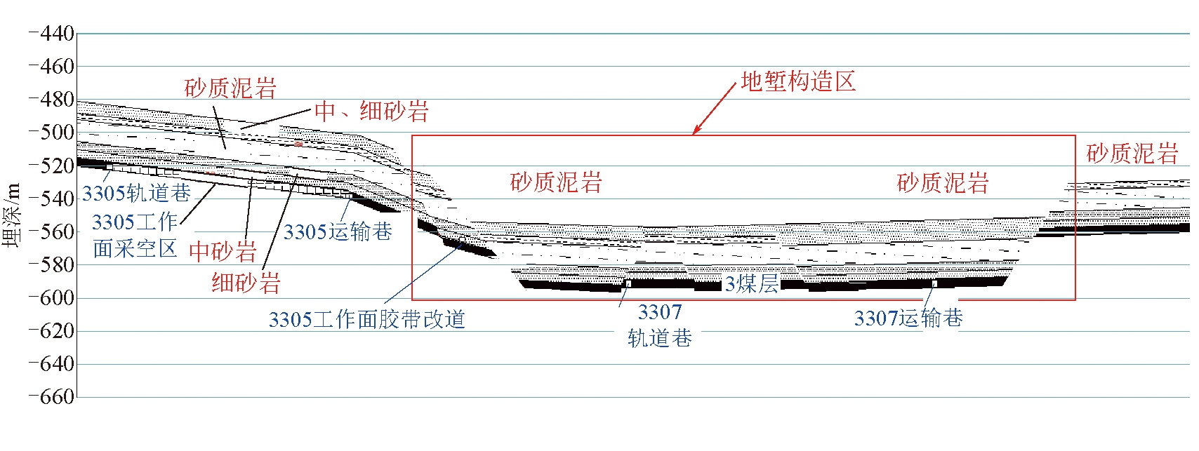 ★ 煤矿安全 ★ 地堑构造区综放工作面开采诱冲机理及防治技术冲击地压是煤炭开采过程中出现的一种严重的动力灾害。随着我国煤矿开采深度和开采强度的逐年加大,冲击地压灾害的发生频次、强度及破坏程度呈上升趋势,冲击地压已经成为我国深部煤矿开采所面临的重大安全问题[1-2]。 地堑构造是由断层形成的一种特殊地质结构,为两侧被高角度断层围限、中间下降的槽形断块构造。研究表明,冲击地压的空间分布明显受控于区域内大的断裂构造,当采掘工作面临近断层时,工作面或巷道发生冲击地压的概率将明显增加,且与一般冲击地压相比,断层冲击地压破坏性更强、影响范围更大[3-4]。为揭示断层构造诱发冲击地压机理,国内外众多学者开展了大量的研究工作。潘一山等[5]开展了断层冲击地压理论试验与研究,初步揭示了采动诱发断层活化机制;姜耀东等[6]研究了“两硬”条件正断层影响下的冲击地压发生规律;姜福兴等[7]从微震监测角度探究了硬岩断裂型矿震诱发冲击机制。 多数学者对断层冲击地压的研究是针对单一断层展开的,而实际矿山开采过程中断层构造往往并不是单一存在的,多条断层组合形成的阶梯状断层带、地堑和地垒等地质构造在矿山开采中较为常见[8-9]。目前,对这类地质构造区域开采冲击地压发生机制的研究相对较少。因此,笔者以义桥煤矿地堑构造区3307工作面为工程背景,运用数值模拟和现场微震监测的方法分析工作面开采应力场分布及断层活化规律,揭示地堑构造区综放工作面开采诱冲机理,并针对性提出工作面冲击地压防治技术,确保工作面安全高效生产,同时为类似地质条件下冲击地压防治提供参考。 1 工程背景3307工作面是义桥煤矿三采区第3个综放工作面,整体埋深为390~760 m。工作面四周被断层切割形成地堑,北侧为SF21断层(∠60°H,落差33 m),南侧为SF6(∠60°H,落差40 m),西侧为YF7断层(∠70°H,落差>600 m),东侧为三采区集中巷,3307工作面位置剖面如图1所示。