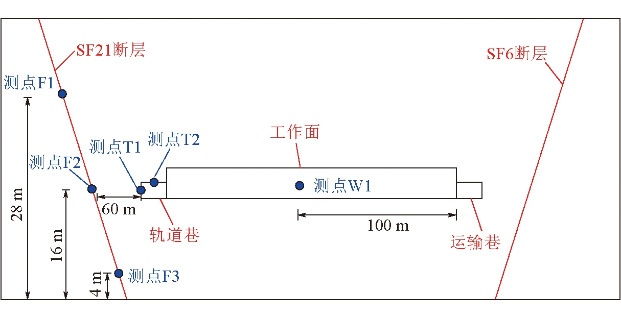 煤岩层厚度/m密度/(kg·m-3)体积模量/GPa剪切模量/GPa内摩擦角/(°)内聚力/MPa抗拉强度/MPa底板35.02 40014.58.727.014.06.0细、粉砂岩9.02 50018.510.228.016.07.6细、粉砂岩11.02 50018.510.228.016.07.6砂质泥岩13.02 20014.58.724.08.02.0煤4.01 3535.32.029.05.61.0泥岩1.02 20020.512.524.09.02.0砂岩12.02 50024.013.826.020.08.0砂质泥岩213.02 20014.58.724.08.02.0 2.2 数值模拟方案及内容模型采用摩尔库伦破坏准则,每推进5 m平衡一次(以y=0为起始点,沿y方向进行推进),并获取每一推进步距下y=35 m监测断面上各监测点(监测点分别位于巷道围岩、工作面内煤体以及断层带上)的应力参量。各监测点分布如图3所示。