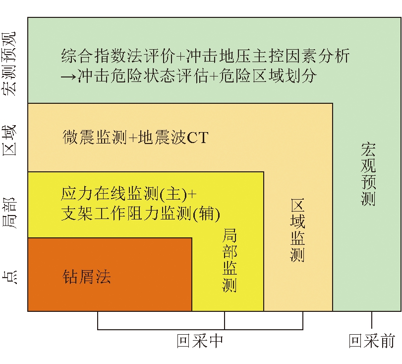 图6 不同工况下断层面F1测点垂直应力值 由图6分析可得:随着推进步距增加,工作面开采范围不断增大,断层带上测点垂直应力呈现增加的趋势,且工作面距离断层越近,测点垂直应力增加速率越高。受地堑区断层构造应力和工作面采动应力叠加影响,靠近断层开采时更易造成煤体承载力降低、断层带剪应力增大,一旦超过断层剪切强度,极易诱发断层滑移错动,导致冲击事故的发生。 3 工作面冲击地压综合防治技术体系根据上述分析可知,受断层形成的地堑构造影响,3307工作面采掘期间具有一定的冲击地压风险,特别是工作面距离巷道较近的区域冲击危险较高。基于此,3307工作面回采期间采用超前危险区预测-大直径钻孔强卸压-多源信息监测预警于一体的冲击地压综合防治技术体系[11],确保了3307工作面安全生产。 3.1 冲击地压危险等级及危险区超前预测鉴于3307工作面布置于地堑构造区,受埋深、断层、顶板强冲击倾向等影响,工作面回采期间发生冲击地压的风险较高。采用综合指数法[12]对3307工作面冲击地压危险等级进行了评定,考虑工作面地质因素和开采技术因素,综合评定3307工作面具有中等冲击地压危险性,冲击地压危险指数Wt为0.57。 考虑3307工作面所处的特殊地质构造影响,将3307工作面所有巷道均划分为中等冲击地压危险区。 3.2 大直径钻孔强卸压3.2.1 掘进期间 工作面巷道掘进期间,对预先圈定的中等冲击危险区域掘进头和巷道两帮实施大直径钻孔预卸压处理。在巷道掘进头布置1个钻孔,孔径150 mm,孔深20 m,布置在巷道断面的中部;巷道两帮钻孔直径150 mm,孔深15 m,单排布置,钻孔间距2 m,垂直于巷帮布置,钻孔开口位置距煤层底板0.5~1.5 m。 3.2.2 回采期间 工作面回采期间两巷道超前300 m范围内,在掘进期间施工预卸压钻孔的基础上,在两帮错开施工预卸压钻孔,钻孔间距不大于2.0 m,直径150 mm,孔深20 m。同时对于该区域内塌孔的预卸压钻孔实施了复孔或补打措施。 3.3 多源信息监测预警3307工作面回采期间采用微震监测+地震波CT探测+钻屑法检测+应力在线监测构建了工作面区域与局部结合的多源信息监测预警体系,如图7所示。 SOS高精度微震系统对3307工作面实施区域监测,实时监测工作面范围内及周边区域的震动事件。应力在线监测和钻屑法为局部监测,其中应力监测可实现实时监测和在线传输,监测范围为掘进工作面后方200 m和回采工作面超前300 m;钻屑法通常为间隔监测,监测范围为掘进工作面后方60 m和回采工作面超前100 m。支架工作阻力监测作为辅助监测手段,用以分析工作面矿压显现规律,进而指导防冲措施的实施。