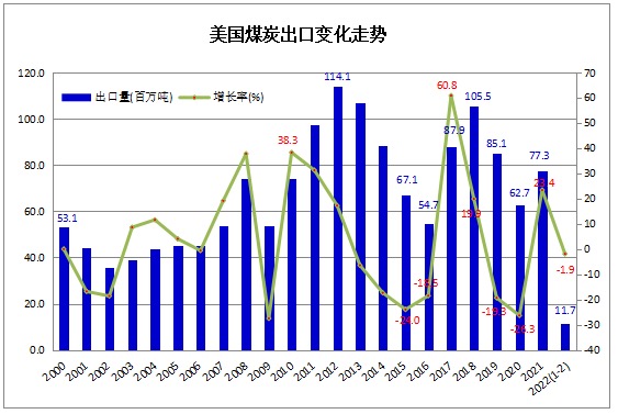 2022年1-2月美国煤炭出口量同比下降1.9%