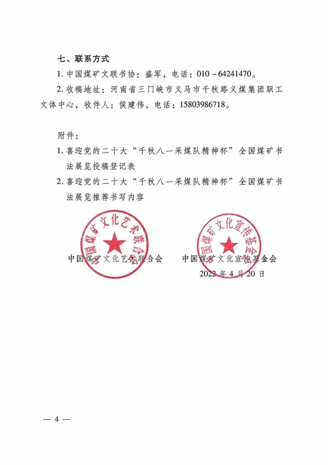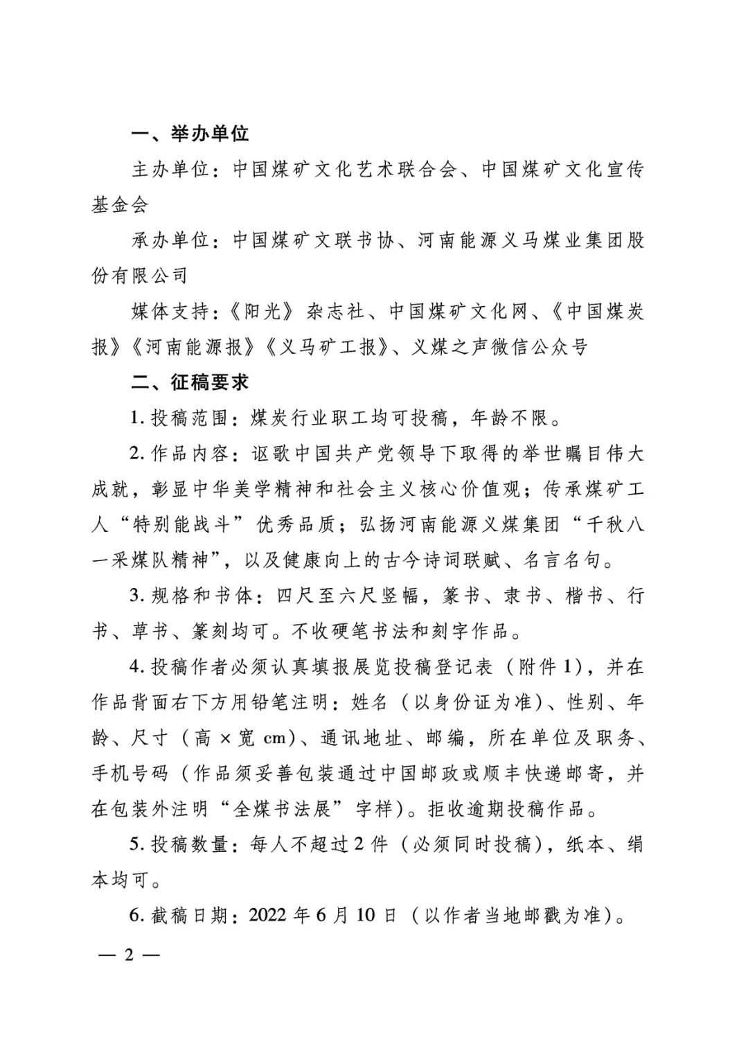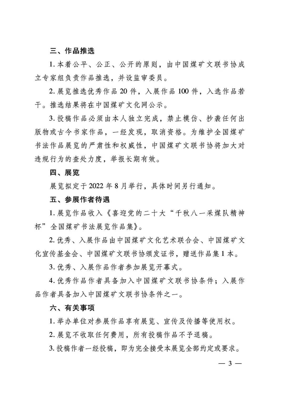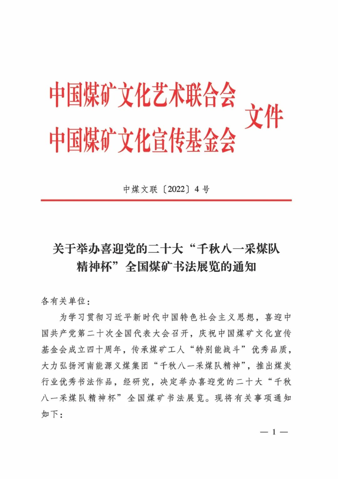 关于举办喜迎党的二十大“千秋八一采煤队精神杯”全国煤矿书法展览的通知 时间:2022-04-26 13:40 来源:中国煤矿文联 作者: 点击:次 (责任编辑:admin) 上一篇:山西省政府安委会第二次全体(扩大)会议暨全省安全生产大检查大整治大提升行动工作动员部署会议召开 下一篇:华能伊敏露天矿生产能力核增至3500万吨/年