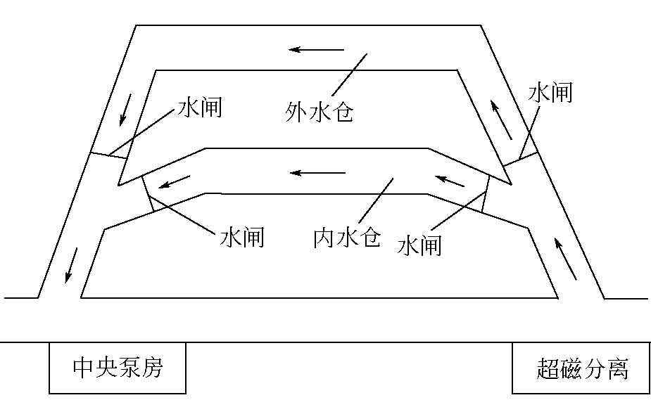 图1 九龙矿矿井水超磁分离工艺流程 矿井水超磁分离技术针对的是含悬浮物矿井水,在混凝过程中加入磁粉及混凝剂,絮体中的磁粉使得絮体具有磁性,在超磁分离机的磁力场作用下,絮体被快速从水中分离,该工艺具有占地少、成本低、处理速率快等优点,是一种新型矿井水处理工艺[7-9]。超磁分离工艺大幅度降低了进入水仓的悬浮物浓度和数量,提高了对矿井水中煤泥的回收,减轻了水仓清理的压力,但对悬浮物浓度高的矿井水,还存在着处理效果欠佳的问题[10]。 根据设计水量计算,九龙矿矿井水处理工艺中,预沉池停留时间约7 min,混凝池停留时间约6.25 min,投加磁种后,沉淀时间缩短,15 s即可完成沉淀[11-12]。由于该矿存在涌水量波动大、矿井水中悬浮物浓度不均匀(300~1600 mg/L)、颗粒物粒度大小不一、超磁分离磁盘单位面积处理能力等问题,当矿井水中悬浮物浓度较低时,超磁分离出水水质较好;在悬浮物浓度较高时,超磁分离出水水质较差,部分悬浮物被带入水仓,在水仓中形成二次沉降,在水仓中形成煤泥。 1.2 改造前水仓相关性况介绍矿井水经超磁分离处理后进入水仓,内水仓和外水仓可以同时进水并联运行,也可以单独进水独立运行。在需要对水仓进行煤泥清理时,则单水仓进水,另一水仓进行煤泥清理。水仓中的矿井水经中央泵提升至地面,完成矿井水处理和排水。该矿井水仓由外水仓和内水仓构成,改造前水仓及运行方式如图2所示。