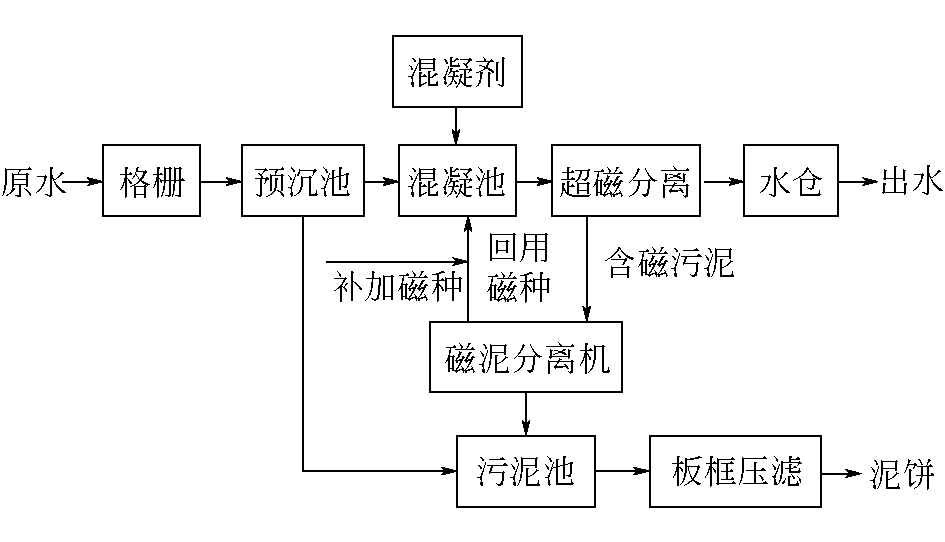 ★ 清洁利用 ★ 九龙矿矿井水二次沉淀水仓改造实例分析冀中能源峰峰集团邯郸宝峰矿业有限公司九龙煤矿(以下简称“九龙矿”)设计生产能力为120万t/a,煤种为焦煤,具有低硫、黏结性强、结焦性好等特点,该矿井田南北平均长约8 km,东西宽约2.5 km,面积约22 km2。该矿在煤炭开采过程中通过实施保水开采和区域超前勘查治理,从源头控制煤炭开采过程中的矿井水产生量。目前该矿矿井水产生量约160万m3/a,经超磁分离工艺处理后进入水仓储存,经中央提升泵房提升至地面进行利用或排放。 通常在煤矿生产过程中工况多变,矿井水涌水量、悬浮物浓度、颗粒物粒度等水质参数存在波动较大的问题[1-2]。九龙矿矿井水资源丰富,矿井水在经超磁分离处理后,仍存在部分颗粒物随矿井水进入内、外水仓,在水仓中二次沉降形成煤泥(污泥)。水仓中沉积的煤泥一方面会减少水仓的有效容积需及时清理,另一方面煤泥极具可回收价值,煤泥清理的彻底程度直接决定了煤泥清理的经济效益。 由于传统水仓的清淤方式存在煤泥回收率低、工作安全风险大、危险系数高、作业环境差、劳动强度高、清理效率低、耗费时间长、影响矿井安全生产等问题[3-5],为了提高对水仓中沉淀煤泥的回收,解决水仓中煤泥清理存在的问题,提高水仓清理效率,九龙矿以现有内水仓为基础,进行二次沉淀水仓改造。通过对水仓进行二次沉淀改造,实现超磁分离出水中煤泥集中沉降后,又采用煤泥自动清理机进行煤泥清理,既降低了劳动强度、缩短了清理时间,又提高了煤泥清理效率,达到了改造预期目的,创造了良好的社会效益和经济效益。 1 矿井水处理现状1.1 矿井水处理工艺当前矿井水处理主要包括格栅、预沉池、混凝池、超磁分离等过程。预沉池可以对矿井水中的部分粗颗粒物进行去除,矿井水(原水)通过格栅进入预沉池后,在混凝池与磁粉、聚合氯化铝(PAC)、聚丙烯酰胺(PAM)等混凝剂进行充分混合接触后形成磁絮凝体,由超磁分离机对磁絮凝体与水进行分离,实现矿井水净化,处理后出水进入水仓,由中央泵房提升至地面利用或排放。超磁分离机脱除的磁絮凝体进入磁泥分离机,进行磁粉的回收及利用;预沉池污泥、磁泥分离机排泥都进入污泥池,通过板框压滤机形成泥饼并回收[6]。九龙矿矿井水超磁分离工艺流程如图1所示。