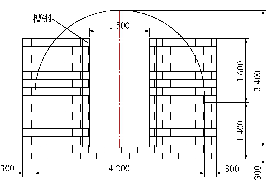 图3 二次沉淀水仓改造及运行方式 由图3可以看出,超磁分离处理后出水由水沟进入排污巷,再进入二次沉淀水仓,经由溢流墙进入外水仓。矿井水中的悬浮物在二次沉淀水仓部位完成沉淀分离,沉降煤泥集中在二次沉淀水仓段,缩短煤泥清理的水仓长度,便于煤泥清理机自动清理煤泥,提高煤泥清理效率。根据设计要求,二次沉淀水仓长为174 m,挡水墙厚度为0.37 m,挡水墙顶相对水仓底高度为2.7 m,挡水墙宽度为4.8 m,二次沉淀水仓净宽度为4 m,挡水墙结构如图4所示。 施工前,对巷道两侧及底板进行开挖槽沟,槽沟宽为0.37 m,两侧及底板槽沟深均为0.30 m。挖好槽沟后喷浆封闭,底板采用水泥砂浆铺底找平再进行砌墙,水仓内挡水墙侧面垂直砌入16号槽钢作为挡板槽,加设长为1.5 m的活动堰板,保持二次沉淀水仓及原内、外水仓的灵活运行。 溢流墙包括固定基础和活动堰板,固定基础面(即活动堰板底部)相对挡水墙底部高差2.5 m,活动堰板墙高度1.5 m,溢流墙厚度0.37 m,溢流墙活动堰板结构与挡水墙相似。 二次沉淀水仓正常运行时,挡水墙加设堰板高度2.7 m,溢流墙不加堰板,以固定基础高度2.5 m(相对挡水墙底部高度)进行运行,二次沉淀水仓形成长×宽×深为174.0 m×4.0 m×2.5 m的封闭空间,总容积1 740 m3。超磁分离处理后出水进入二次沉淀水仓,进行煤泥的二次沉降。